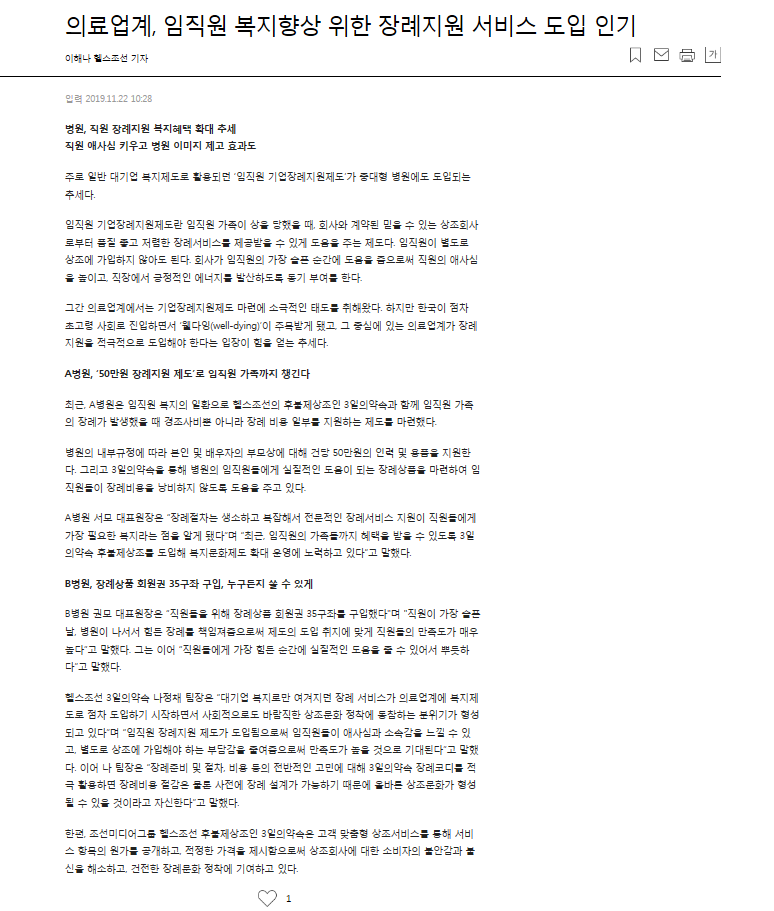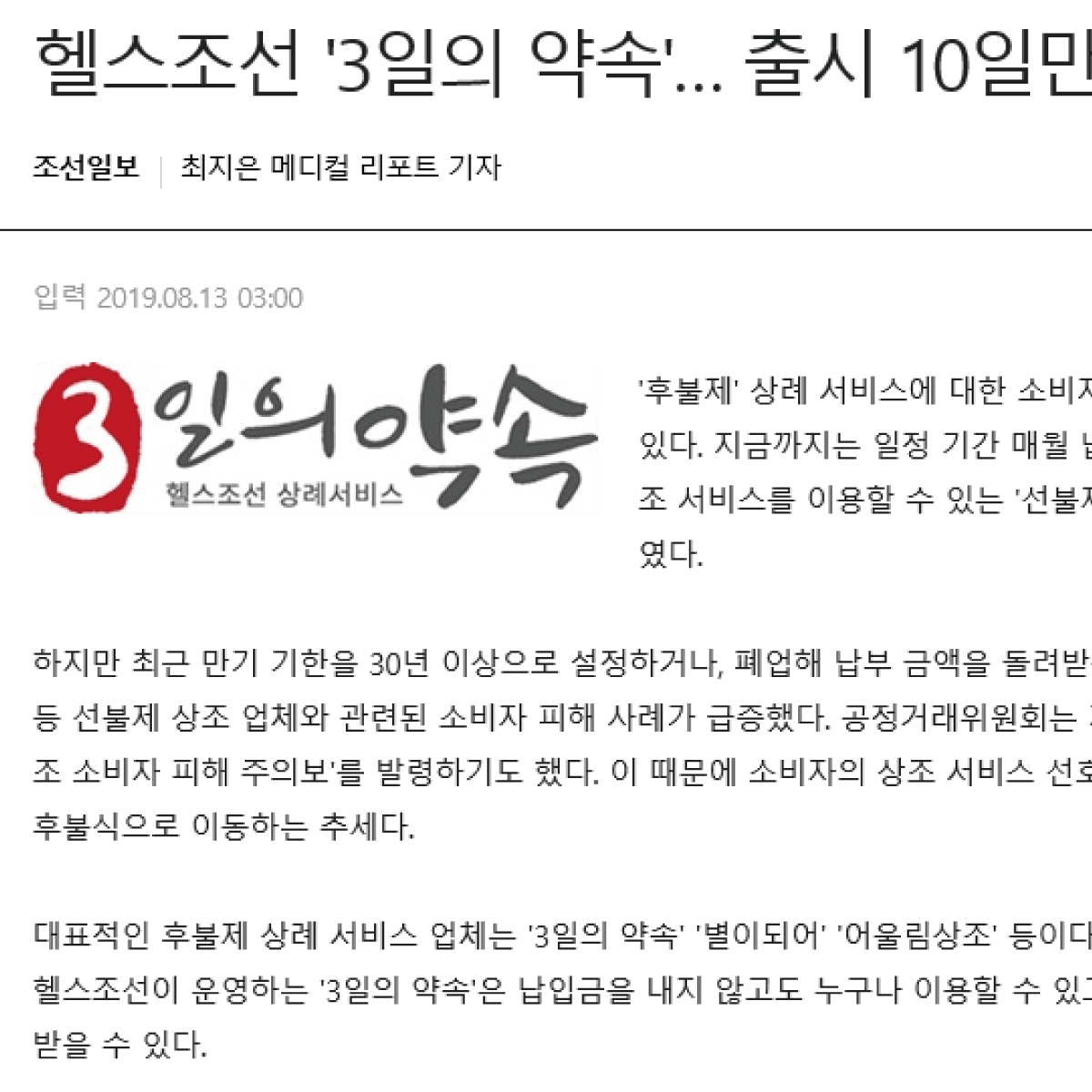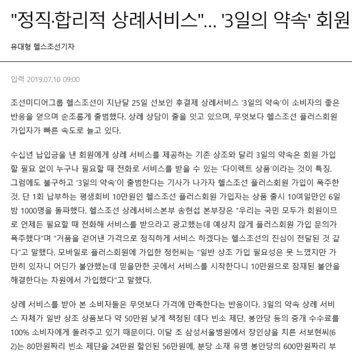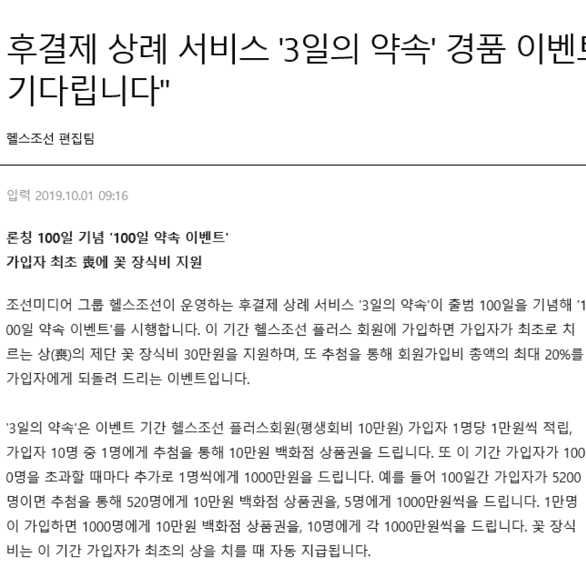 조선미디어그룹의 헬스조선이 선보이는 '3일의 약속'은 고품격 후불제 상례 서비스로, 고객의 가치를 최대 사명으로 여기고 '건전한 상례 문화 정착'을 위해 나아가겠습니다.