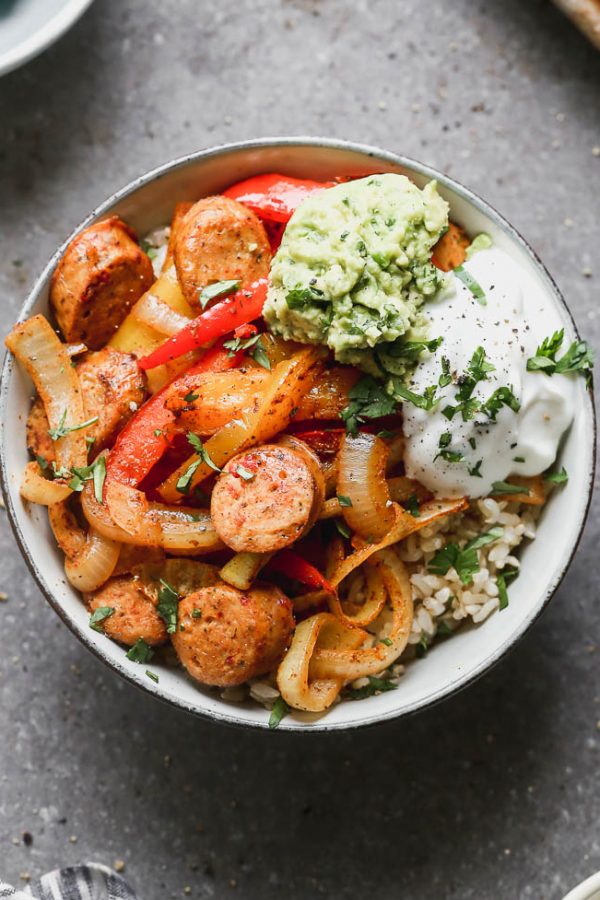 | Sheet pan fajita bowls with chicken sausage |