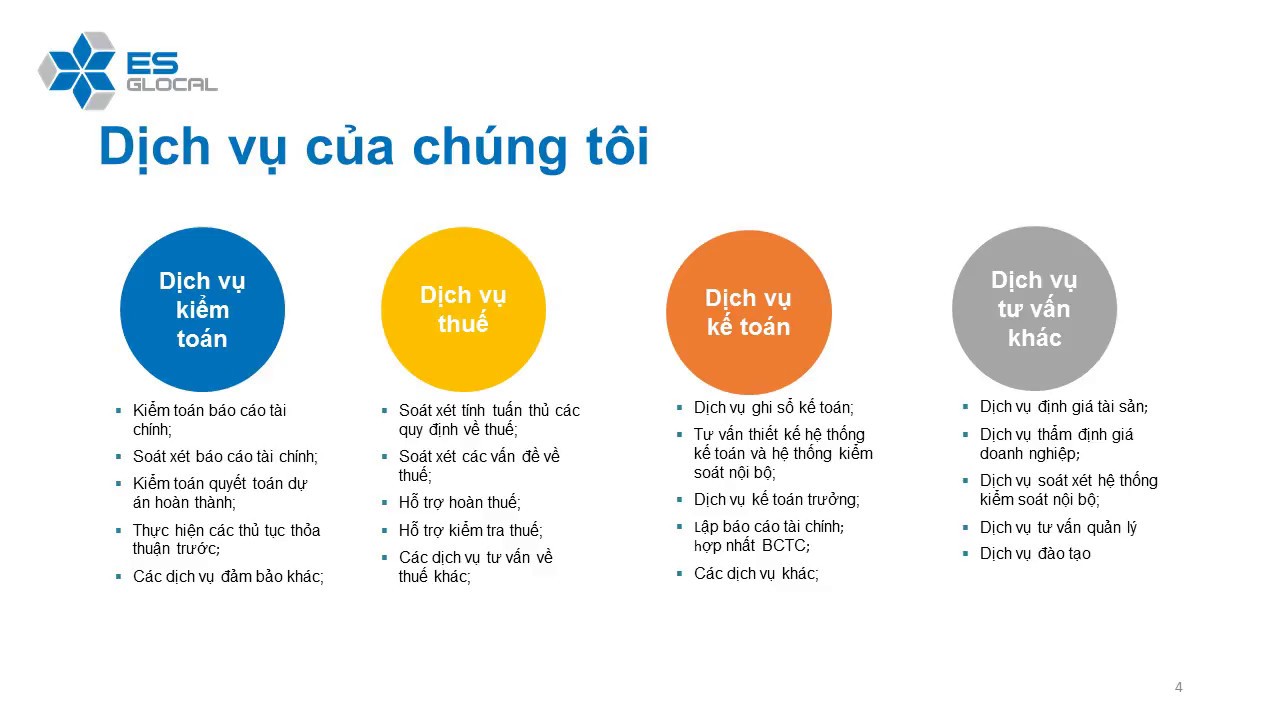 Hãng Kiểm toán ES-GLOCAL cung cấp Dịch vụ Kiểm toán, Dịch vụ Kế toán, Thẩm định giá UY TÍN và CHẤT LƯỢNG khẳng định bằng 10 năm KN...