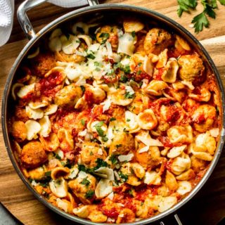 | Orecchiette with baked mini chicken meatballs in tomato cream sauce |