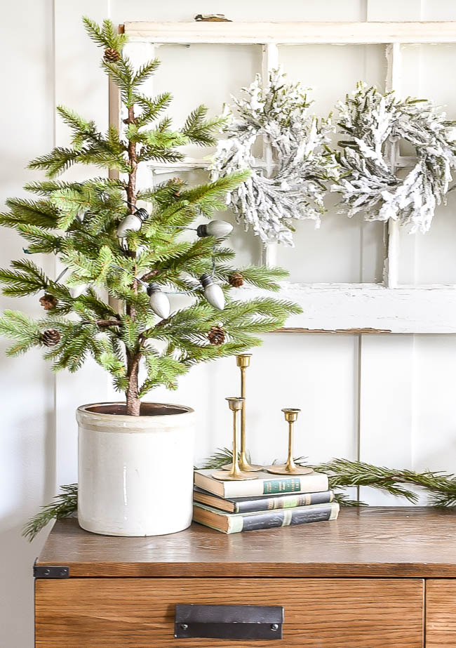 | A beautiful neutral christmas entry decked out with stylish vintage and affordable decor! |
